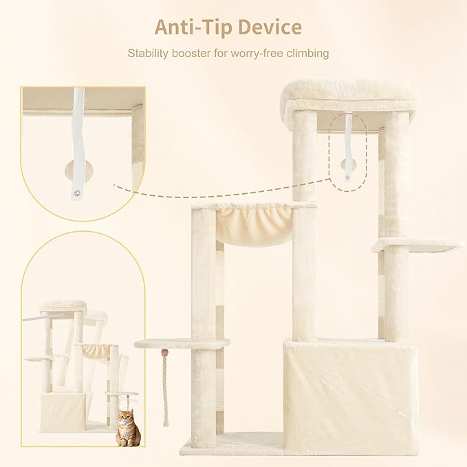 Heybly Heavy Duty Cat Tree, Tower for Indoor Cats Large Adult, Tall Cat Condo House with Extra-Large Baseboard, Multi-Level Plush Furniture with Scratching Posts, Hammock,Toy Balls, Beige HCT026M