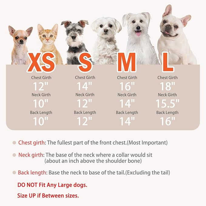 - 4 Available Sizes for choose: Size: XS(Chest girth: 12", neck girth: 10", body length: 10"), S(Chest girth: 14", neck girth: 12", body length: 12"), M(Chest girth: 16", neck girth: 14", body length: 14"), L(Chest girth: 18", neck girth: 15.5", body length: 16")