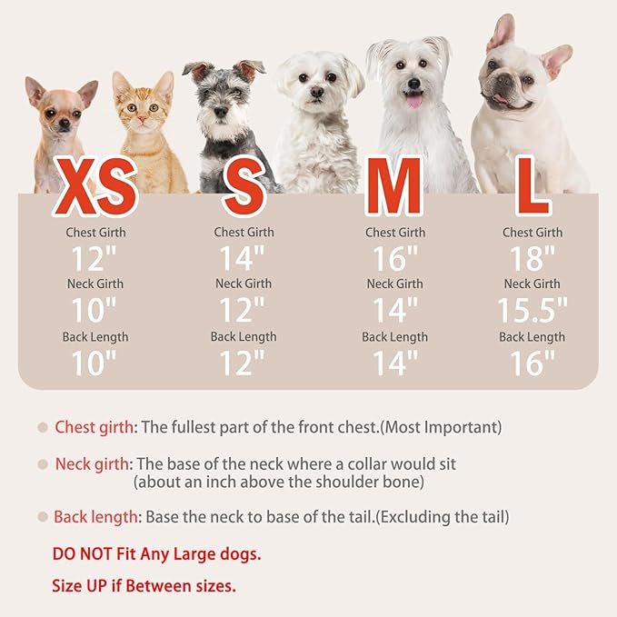 - 4 Available Sizes for choose: Size: XS(Chest girth: 12", neck girth: 10", body length: 10"), S(Chest girth: 14", neck girth: 12", body length: 12"), M(Chest girth: 16", neck girth: 14", body length: 14"), L(Chest girth: 18", neck girth: 15.5", body length: 16")