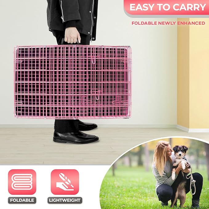 FDW Dog Crate for Medium Dogs 30 Inch Folding Metal WirePet Cage Double Door W/Divider Panel Indoor Outdoor Kennel Leak-Proof Plastic Tray,Pink