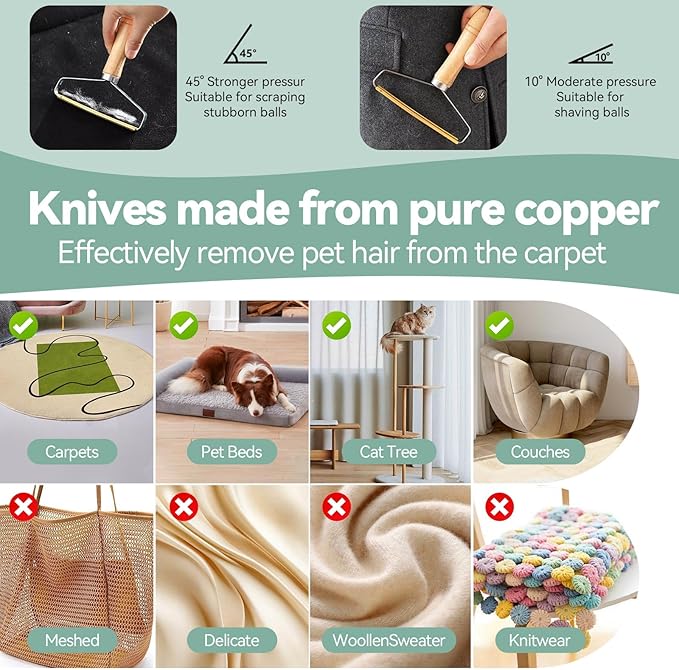 - 【4 TYPES FOR VARIOUS SCENARIOS】The copper head scraper is for stubborn pet hair, great for heavy-duty and thick-piled items, such as carpets, car mats, rugs, cat trees, etc. The green plastic handle can be used in carpets, sofas, cat trees, all kinds of furniture and other heavy items; The blue handle of the pet hair remover contains a double row of combs, which can clean the hair with less effort; The grooming gloves can easily and gently remove loose pet hair and tangles so no fur goes flying.