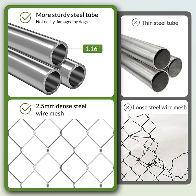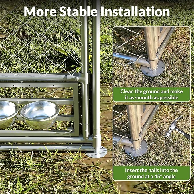 - Upgraded Durability and Stability: Constructed from 1.16" galvanized metal pipes and a 2.5mm thickened steel mesh, this dog kennel outdoor is designed to resist rust, deformation, and harsh weather. Ground stakes can be anchored through the base holes to secure the kennel firmly, enhancing overall stability.