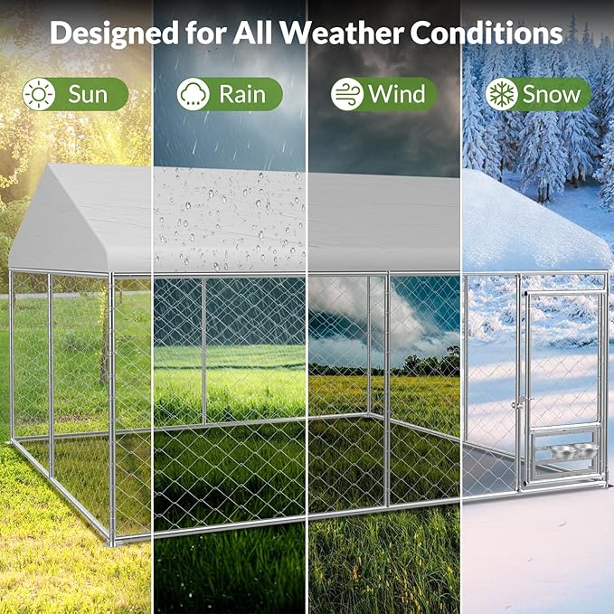 Rovibek 10x10 Ft Dog Kennel Outside, Outdoor Dog Kennel with Roof, Dog Kennels Outdoor with Steel Rotating Feeder Bowls, Outside Kennel for Large Dogs