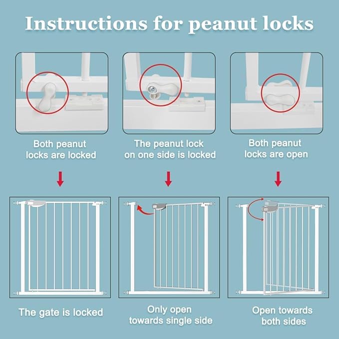 - 【Multiple modes】 Our triple lock gate has various statuses to meet your multiple needs in life. When all three locks are locked, little babies or pets will be stopped by it. At the bottom , there are two peanut locks to control the opening direction and locking. If the peanut lock on one side is locked, the gate can only be opened towards single side. If both peanut locks are open, the gate can swing both ways. Besides, it will stay open at 90 degrees and auto-close when it's less than that