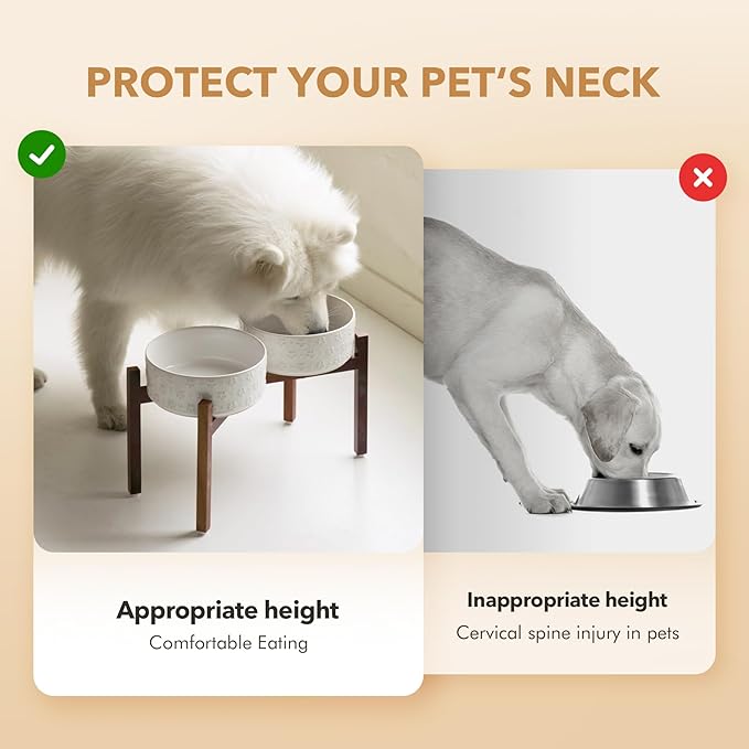 Ceramic 8.2inch Raised Double-Bowl Set with Acacia Wooden Stand, Food & Water Bowls for Large Breed Dogs, Weighted Dog Dishes, Pet Bowl (60 oz)