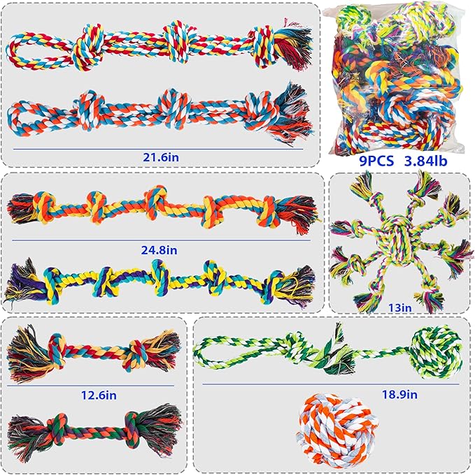 - 🐶【Best Offer Dog Toy Set】Designed for medium and large dogs.Larger, thicker, and more durable than other toys. Includes 1✖(13 inch)Eight Legs Rope Ball, 2✖(24.8 inch) Five-knot long rope, 2✖(21.6-inch) Heavy-duty tug-of-war dog toys, 1✖Hand-held round rope ball dog toys, 2✖Two-kont ropes, and 1✖ball toy. The variety of styles and bright colors can stimulate the dog's senses and encourage the dog to play actively and be mentally engaged.