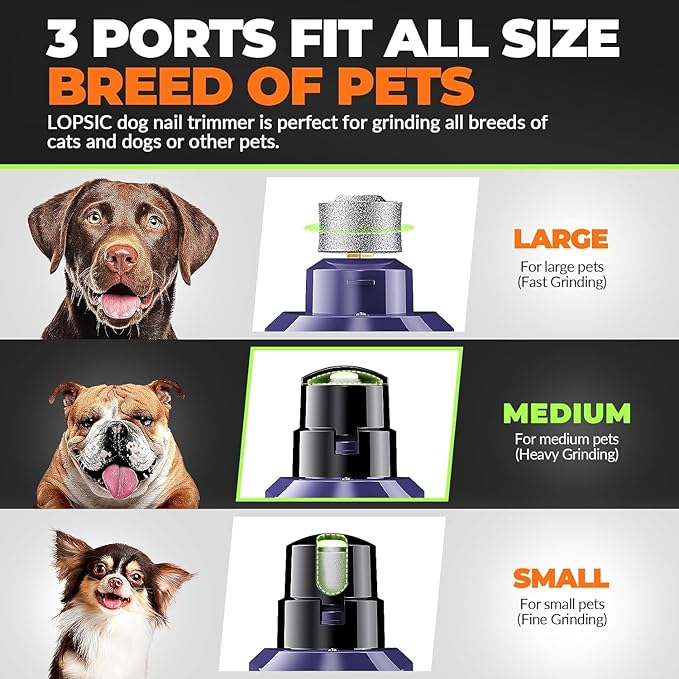 - 【3 Grinding Ports & Rechargeable】: LOPSIC dog nail grinder has 3 grinding ports for grinding different sized pets’ nails, suitable for all types of large,medium, small animal nail care and cat claw care. You can select an appropriate port to trim nails of different thicknesses and lengths. The dog nail trimmers are specially designed rechargeable devices, making it convenient to charge and use this dog nail grinder for dogs anytime and anywhere