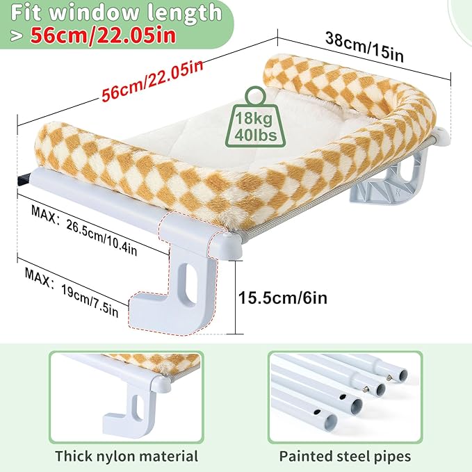 - Important Size Notice – The cat window perch measures 22.05" × 15". Please confirm your windowsill size before purchase. Suitable only for sills with an edge shorter than 2.76", a slot gap over 0.08", and a slot depth of at least 0.6"