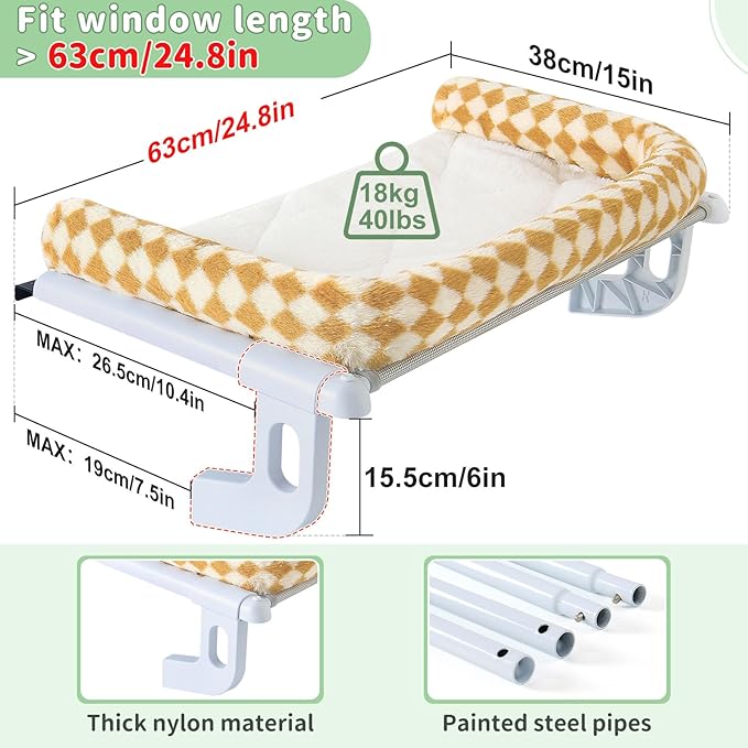 - Tool-Free Setup – No drilling or suction cups required! This cat bed features an upgraded hook-and-bracket system with adjustable clamps that fits most windowsills. Quick to set up, and easy to move between windows, bedsides, or cabinets