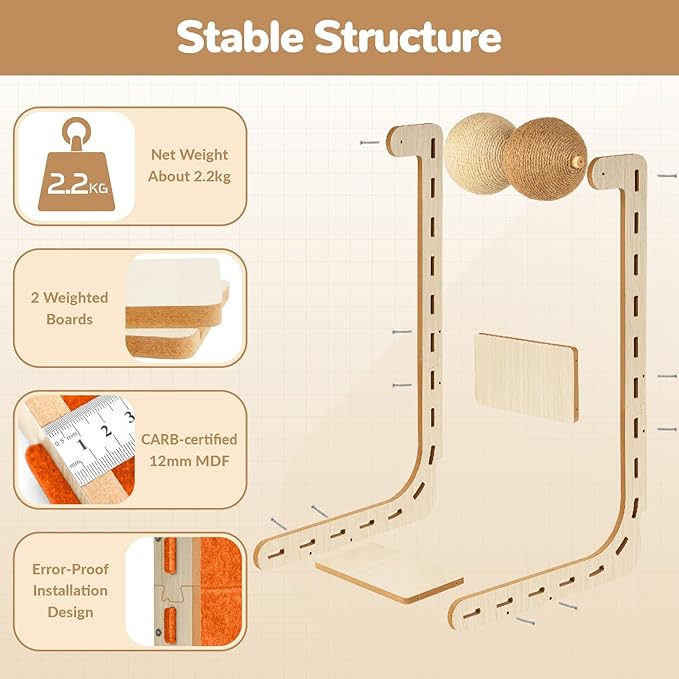 - Constructional Upgrade: The Nxwjoy cat scratching mat features a 10cm gap to accommodate wall skirting. Made from CARB-certified 12mm MDF, its sturdy structure weighs approximately 2.2kg, ensuring stability for adult cats during use. A mistake-proof design has been upgraded to the board joints to prevent installation errors, and upgraded materials resist damage from repeated assembly and disassembly.
