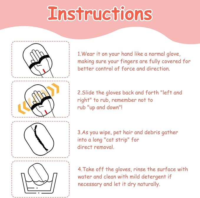 - Easy Cleaning: Powered by advanced electrostatic technology, double-sided grooming gloves can attract lint, pet hair and dust with a simple slide. No more laborious rolling or repeatedly picking up stubborn debris! This efficient cleaning method not only quickly removes surface impurities, but also ensures that your home environment is always clean. Whether it is sofas, carpets or clothes, cat grooming gloves can easily handle it, making cleaning simple and fast.