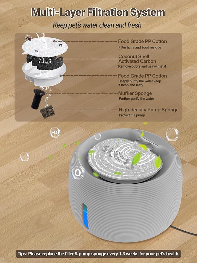 - 5-Layer Filtration: The water fountain with multi-layer filtration system can effectively remove hair, food residues, dust, odors, heavy metals from the water, providing clean and fresh water for your pets.