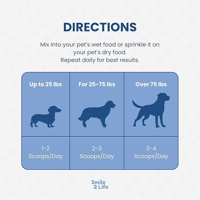 - ✅ FOR ALL DOG SIZES & BREEDS – Includes 2g scoop for accurate dosage: 1–2 scoops up to 25 lbs 2–3 scoops for 25–75 lbs 3–4 scoops for over 75 lbs. Each bottle provides up to 45 servings, making it an effective and long-lasting dental care solution for small, medium, and large dogs. Perfect for multi-dog homes.