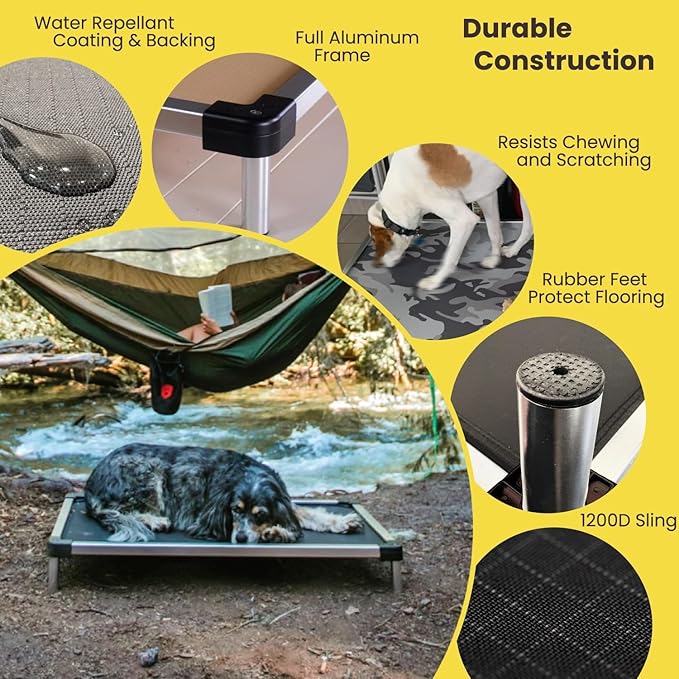 - Durable Ripstop Ballistic Bed Sling: This heavy-duty fabric features a dense weave (1200D) of thick fibers to withstand punctures and tears from scratching, digging, and chewing. It’s also resistant to dirt, fur, odor, and water, making it both easy to clean and a great elevated bed for use inside the home and outside.