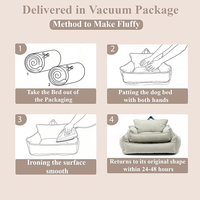 - CARE INSTRUCTIONS: After unboxing, gently fluff the dog bed by patting and ironing the cover. Allow 48-72 hours for the bed to fully expand and regain its intended shape.