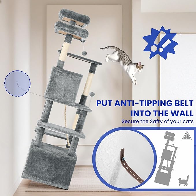 69-Inch Tall Cat Tree with Huge Condos, Multi-Functional Cat Tower with Top Perches, Scratching Posts, Pompoms, for Climbing, Lounging and Playing (Grey)