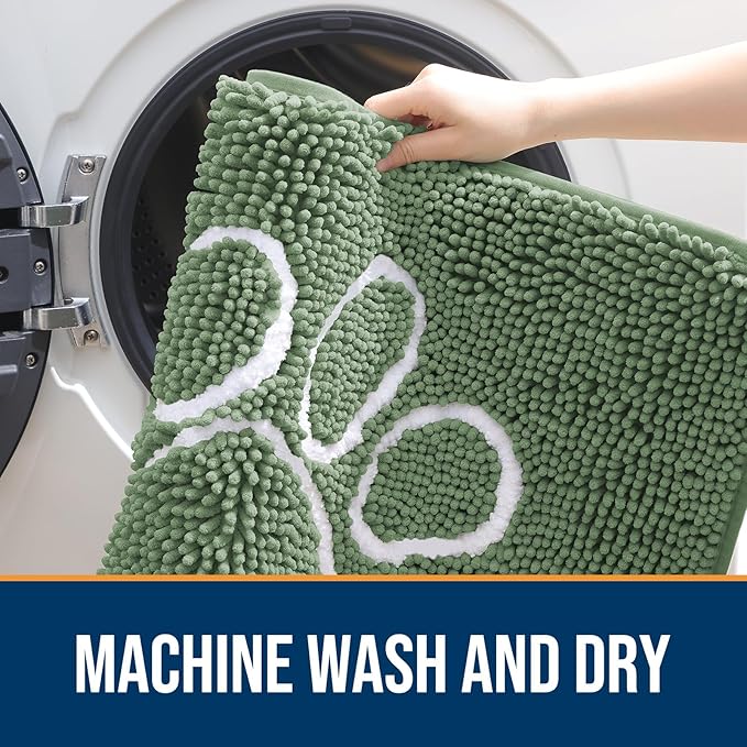 OLANLY Dog Door Mat for Muddy Paws 48x30, Paw Print Design, Absorbs Moisture and Dirt, Non-Slip Washable Doormat, Quick Dry Chenille Mud Mat, Entry Indoor Entryway Carpet, Olive Green and White