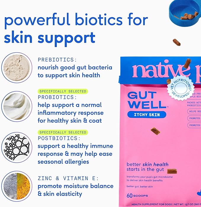 - SKIN-SUPPORTING TRIPLE-BIOTICS FOR REAL RESULTS: Our targeted pre, pro, and postbiotics work together to promote a normal inflammatory response, nourish the gut, and provide dog allergies and itching relief, the best itchy skin relief for dogs with seasonal sensitivities.