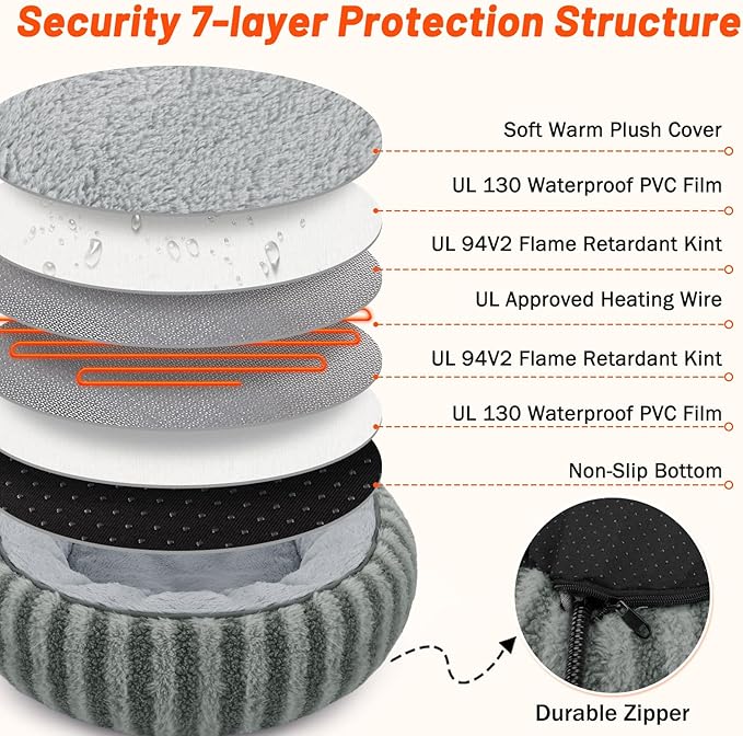 - 【Safety First, Anti-Bite Material】Our heating cat bed to prevent cats from biting the wire and getting electrocuted, the wire is wrapped in a spiral chew-resistant cover. The 7-layer protective structure, featuring a UL-certified heating wire, safeguards pets from burns. Additionally, a soft PVC envelope provides waterproof and flame-retardant protection.
