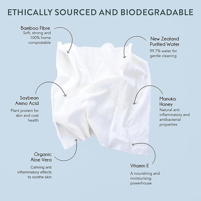 - ๐๐๐ง๐ญ๐ฅ๐, ๐๐ฅ๐๐ง๐ญ-๐๐๐ฌ๐๐ ๐๐จ๐ ๐๐ข๐ฉ๐๐ฌ: Thick, biodegradable bamboo wipes infused with Manuka Honey, Aloe Vera, and Vitamin E for safe daily cleaning of paws, face, ears, and body.