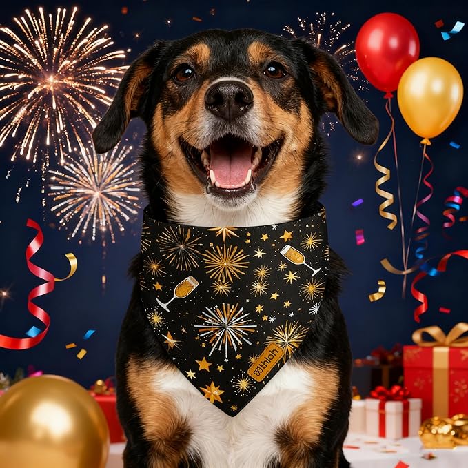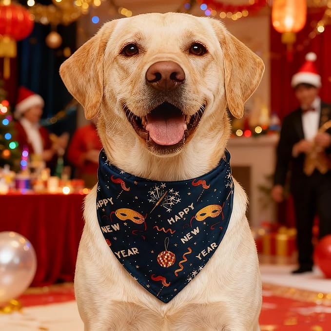 Happy New Year Dog Bandanas with Snap Button, 2 Pack Adjustable Bandanas for Small, Medium, and Large Dogs, Pet Scarf for Holiday Costume Accessory & Photo Shoot (X-Large)