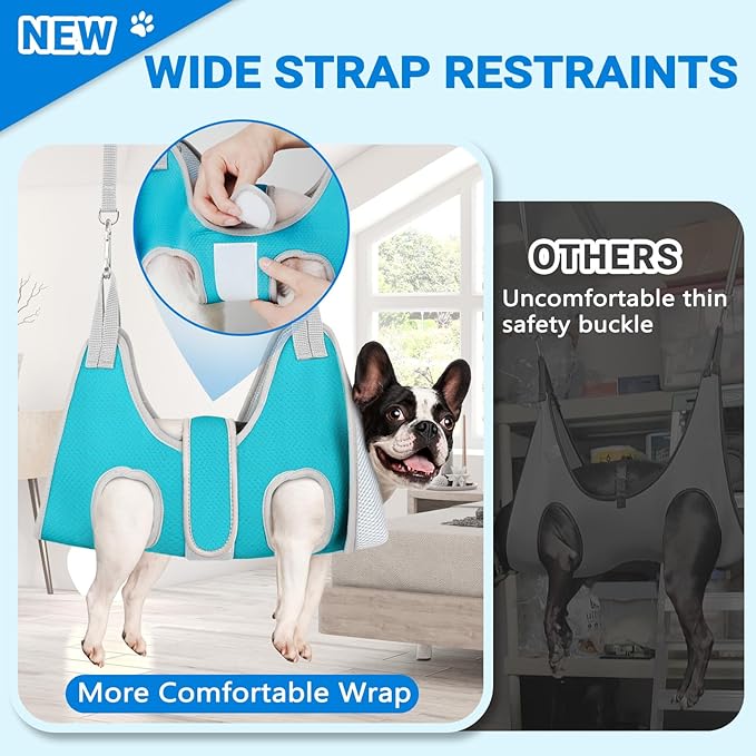 - [Brand New And Excellent Design] This dog grooming hammock features a soft, enveloping design with wide strap restraints. Compared to other products, the grooming dog hammock offers breathable, thickened, soft, sturdy support and easy to clean, ensuring your dog is safe and comfortable when hanged. During grooming or nail trimming, your dog can remain calm on the grooming strap.