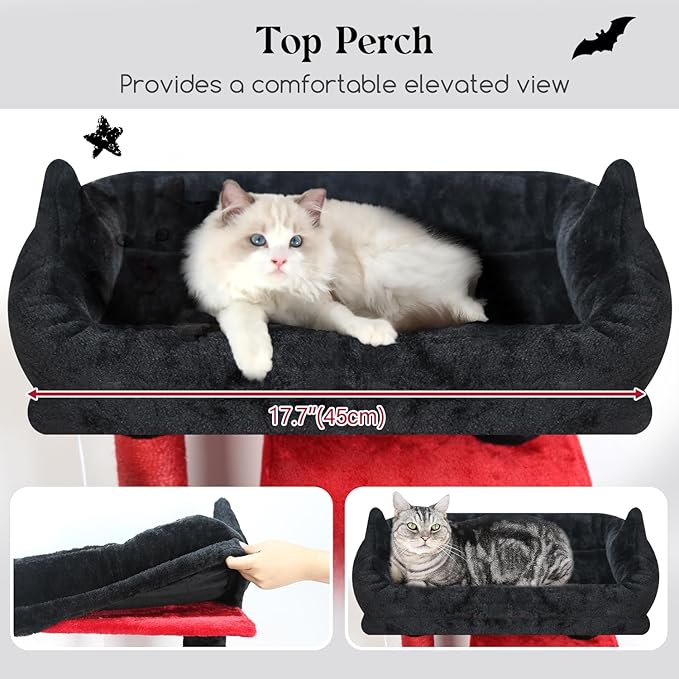- ENLARGED REMOVABLE TOP PERCH - Up to 70 inches tall spooky cat tree features a enlarged padded top platform and a removable pad with two devil horns for easy cleaning and maintenance. It provides cats with ample rest and observation space, combining practicality and fun