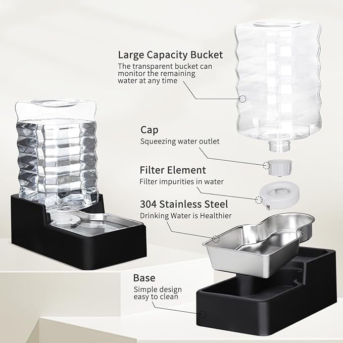- Smart Gravity Feed & Effortless Refilling: Engineered with an efficient gravity-fed system, this dispenser automatically maintains the ideal water level in the stainless steel bowl as your pet drinks. Spills are minimized, and your pet enjoys a comfortable, natural drinking position. Perfect for pet parents with busy schedules—it’s like having a caring assistant for your furry family members!