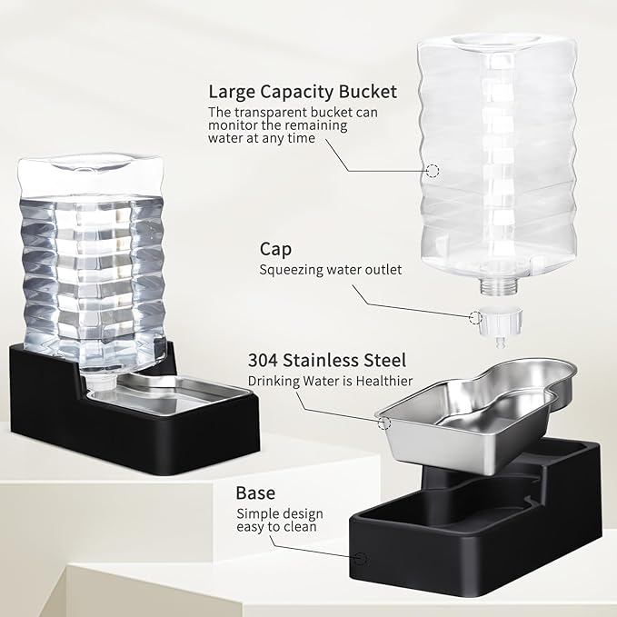 - Smart Gravity Feed & Effortless Refilling: Engineered with an efficient gravity-fed system, this dispenser automatically maintains the ideal water level in the stainless steel bowl as your pet drinks. Spills are minimized, and your pet enjoys a comfortable, natural drinking position. Perfect for pet parents with busy schedules—it’s like having a caring assistant for your furry family members!