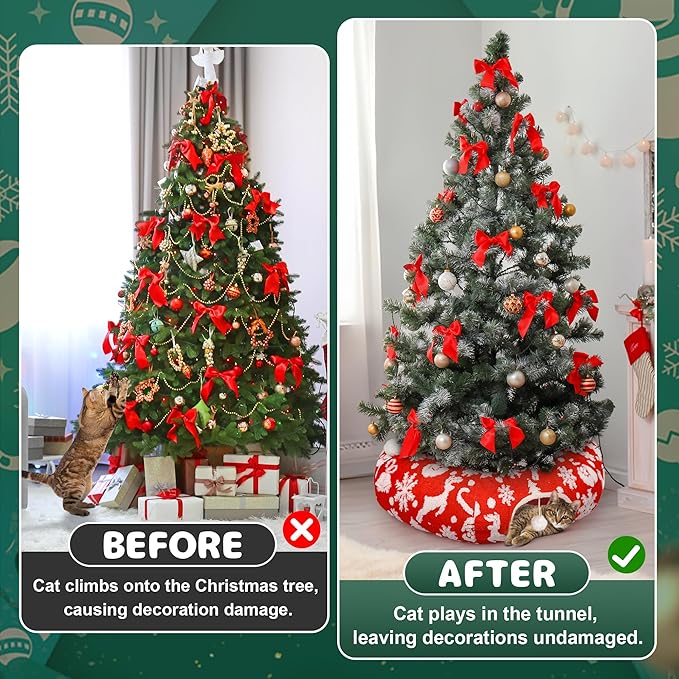 - Cat Tunnel Christmas Tree Skirt:The Christmas cat tunnel can be around your Christmas tree for protection, or spread out into a long tunnel where your cats can hide and play.The tunnel bed features adorable Christmas prints, bringing a touch of festive cheer to your cat's area.
