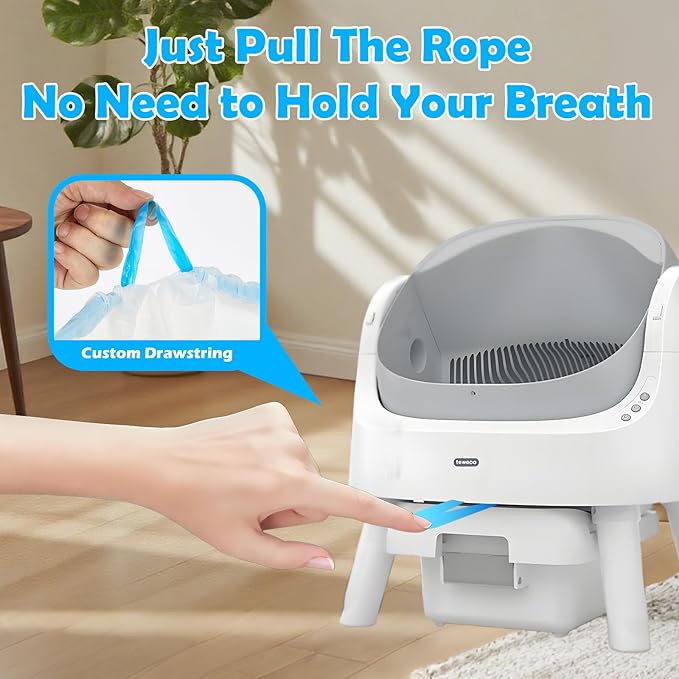 - 【Secure Drawstring for Effortless Disposal】The durable drawstring closure of these automatic litter box bags ensures quick and hygienic disposal—just pull, tie, and toss. Keeps odors and mess contained, promoting a cleaner environment around your cat box liners.