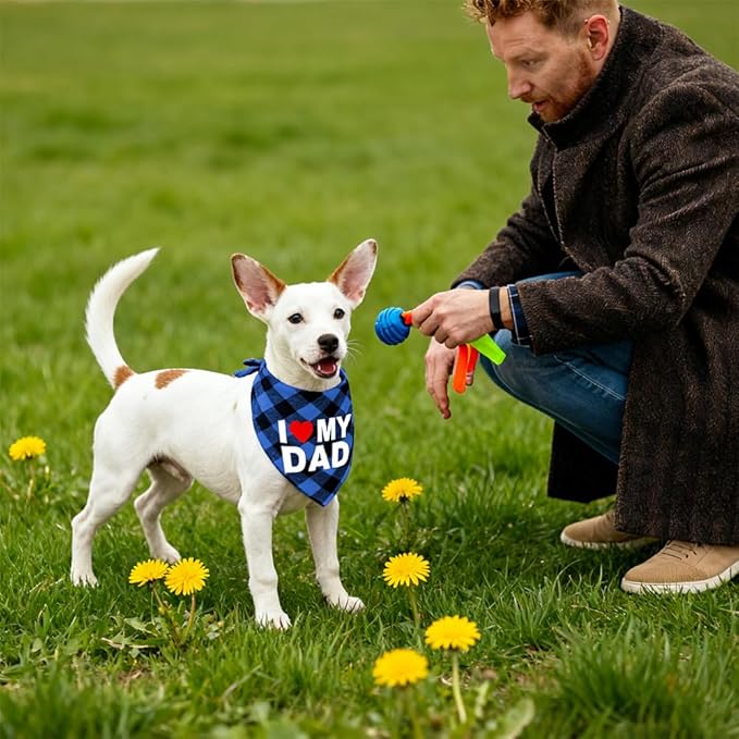 - [Heartwarming “I Love My Mom/Dad” Design] - Featuring two classic plaid styles with “I Love My Mom” and “I Love My Dad” prints, this bandana celebrates the special bond between pets and their parents. It's perfect for keepsake photos and adds a heartwarming touch to any celebration.