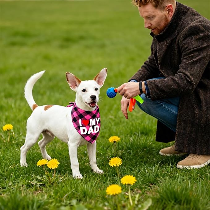- [Heartwarming “I Love My Mom/Dad” Design] - Featuring two classic plaid styles with “I Love My Mom” and “I Love My Dad” prints, this bandana celebrates the special bond between pets and their parents. It's perfect for keepsake photos and adds a heartwarming touch to any celebration.