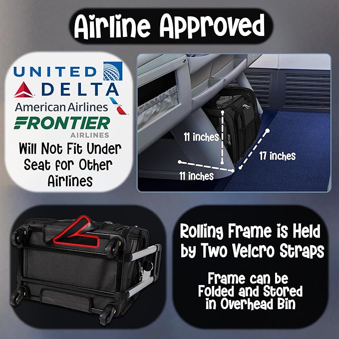 - [ONLY WORKS WITH CERTAIN AIRLINES] Only works for United, Delta, American, and Frontier. 17 inches long, 11 inches tall and 11 inches wide meets airline requirements for fitting under seat.