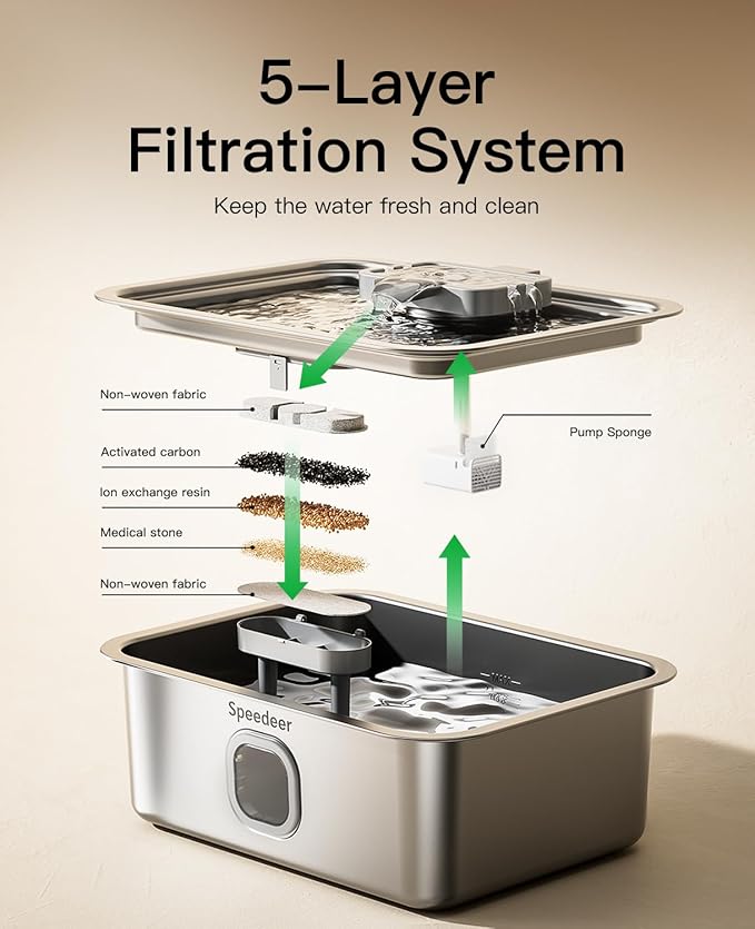 - [Enjoy Every Sip of Fresh Water]: A robust filtration system with 5 layers remove all impurities and provide oxygen-enriched and better-tasting water. 1.Activated carbon removes bad taste and odor 2.Ion exchange resin could soften the tap water 3.Medical stone removes heavy metals and releases trace elements 4.Non-woven fabric could filter hair and impurities 5.The high-density sponge of pump helps remove fine particles.