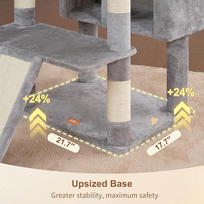 - Extra-Large Base:This cat tree tower features 21.7" x 17.7" oversized thickened base plate strengthens the stability of the tree, With a 24% larger footprint than previous models, it remains secure even when cats jump on and off, ensuring safety during use.