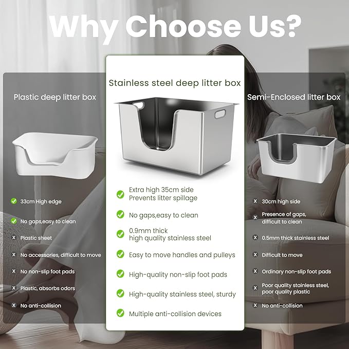 - No Assembly Required: Our high-sided XXL stainless steel cat litter box comes ready to use with no assembly needed, saving you time and effort. The litter box top-entry design offers added convenience. If you have any questions, feel free to contact us, and we'll respond within 24 hours.