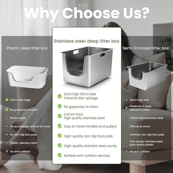 - All Metal Litter Box: Crafted from full stainless steel, rust-resistant, odor-free and non-stick, this high sided litter box boasts 11.8" high sides deep litter box design that prevents cats from kicking litter out of the cat box. One-Piece Stainless Steel cat litter box large for big cats effectively keeps cat urine from leaking and is friendly for high peeing cat