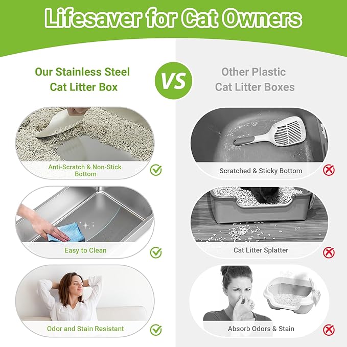 - NON-STICK LITTER BOX STAINLESS STEEL- Easy to wash and clean, no residual odor, rubber anti-slip pads on the bottom of the basin to prevent the big litter box from sliding. Cleaning the high walled enclosed extra large stainless steel litter box with cover for cats is very easy as waste slides off the smooth and nonstick surface effortlessly, leaving no lingering odors behind.
