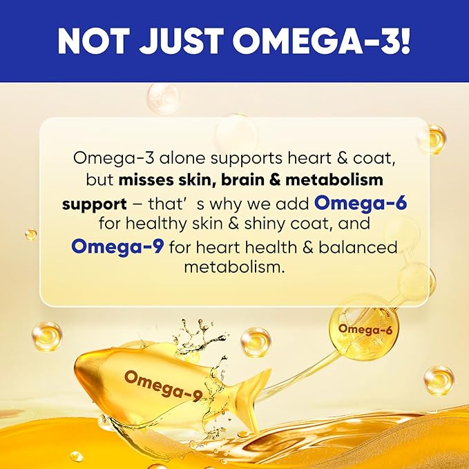 - 【Complete Omega 3-6-9 Balance】While other dog fish oil supplements often emphasize only Omega-3, our product provides a complete and scientifically balanced multi-Omega species. Pets cannot produce Omega-3 and 6 on their own, while Omega-9 works best in synergy —our combination of fish oil for dogs and salmon oil for dogs ensures truly balanced nutrition. It’s the smarter, more complete dog oil for skin and coat, designed for lifelong vitality.