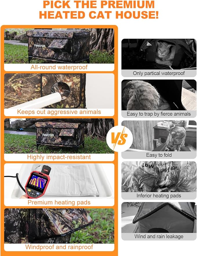 - ๐ช๐ถ๐ป๐ฑ ๐ฎ๐ป๐ฑ ๐ฅ๐ฎ๐ถ๐ป ๐ฅ๐ฒ๐๐ถ๐๐๐ฎ๐ป๐: The elevated, off-ground design of this heated cat bed outdoor prevents moisture buildup. Its heating pad outlet, eaves, roof, and escape door are all waterproof, built to withstand wind and rain. This fully weatherproof heated cat house ensures that your catโs environment remains dry and comfortable.