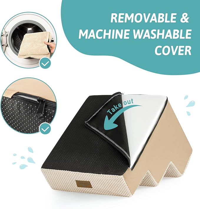 - Non-Slip Base and Removable Cover: Our dog steps for beds are equipped with a non-slip base featuring rubber dots for extra grip, minimizing movement during use. The pet steps cover is waterproof inner side, so you donโt have to worry about stains seeping into the foam. The outer cover is removable and machine washable for easy cleaning
