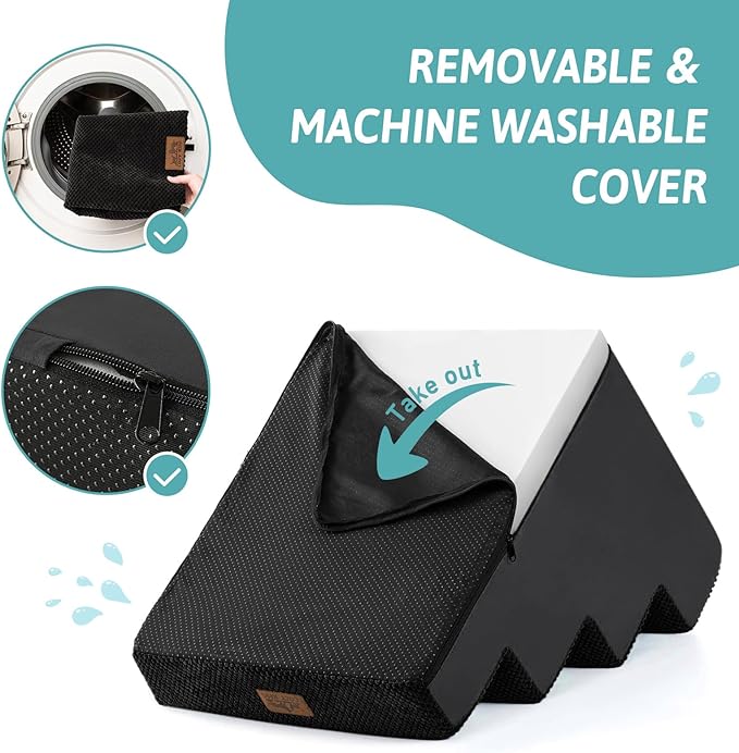 - Non-Slip Base and Removable Cover: Our dog steps for beds are equipped with a non-slip base featuring rubber dots for extra grip, minimizing movement during use. The pet steps cover is waterproof inner side, so you donโt have to worry about stains seeping into the foam. The outer cover is removable and machine washable for easy cleaning
