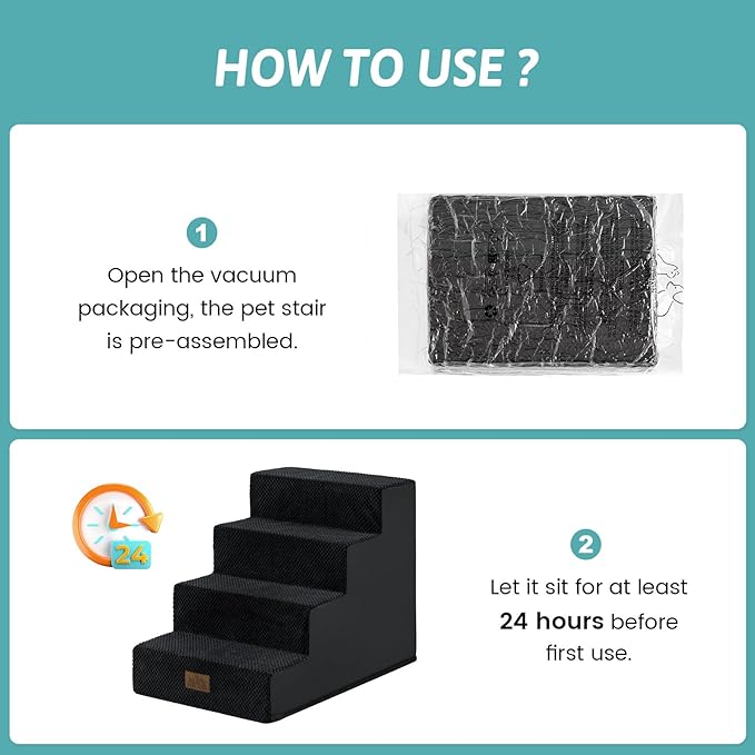 - Easy to Use: Dog stairs are vacuum-compressed and packed together after assembly, so after taking it out of the vacuum-sealed package, please let the sponge sit for 48 hours to fully expand before use. Slight wrinkles on the cover sides may appear after unpacking but can be smoothed out by washing or ironing