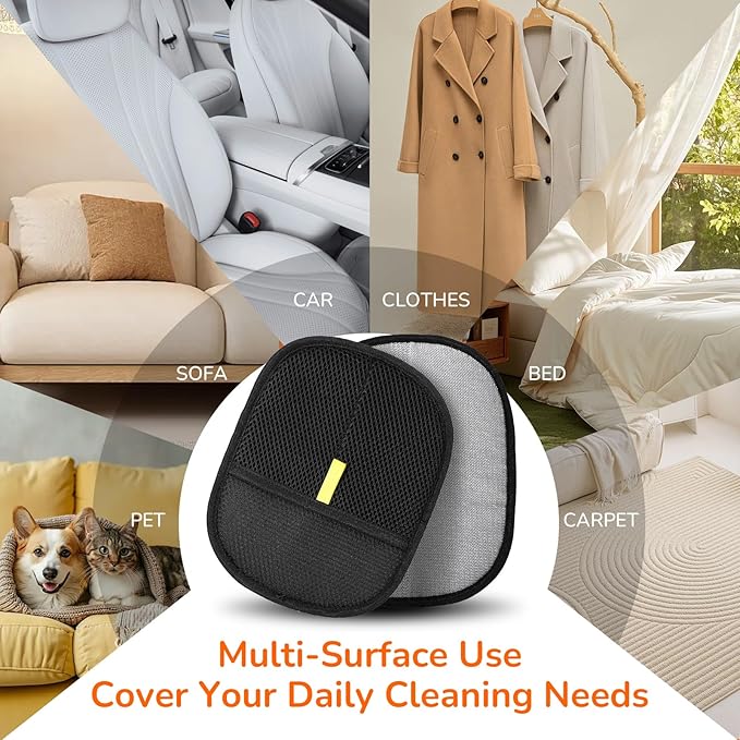 - 🐾【Powerful Static Cleaning】These gloves use electrostatic technology to attract and lift pet hair, lint, and fuzz from couches, curtains, carpets, and other tricky fabric surfaces—without the need for sticky rollers or harsh brushing.