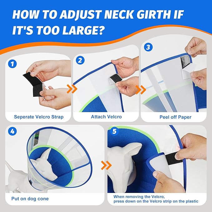 - Warm Tips: It's normal for dogs to feel a bit anxious when using a cone for the first time. Comfort them with treats or toys. Avoid forcefully tearing off the Velcro, as this may startle your dog. Instead, adjust the Velcro to the chin area before gently peeling it open.The dog cone has a fixing strap at the bottom, allowing the dog collar to be threaded through it to prevent the cone from slipping off.