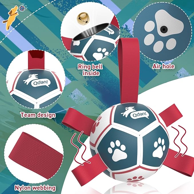 - Upgrade interactive Dog Toy: Dog soccer ball with nylon tabs sewn evenly into the seams not only create an erraticbounce that dogs love to chase, but also make lt easler for the dogs to fetch, toss, tug and retrleve. Dog paws areprinted evenly on the dog loys ball to atlract dog's altention. There's a longer strap for people to hold onto the ball