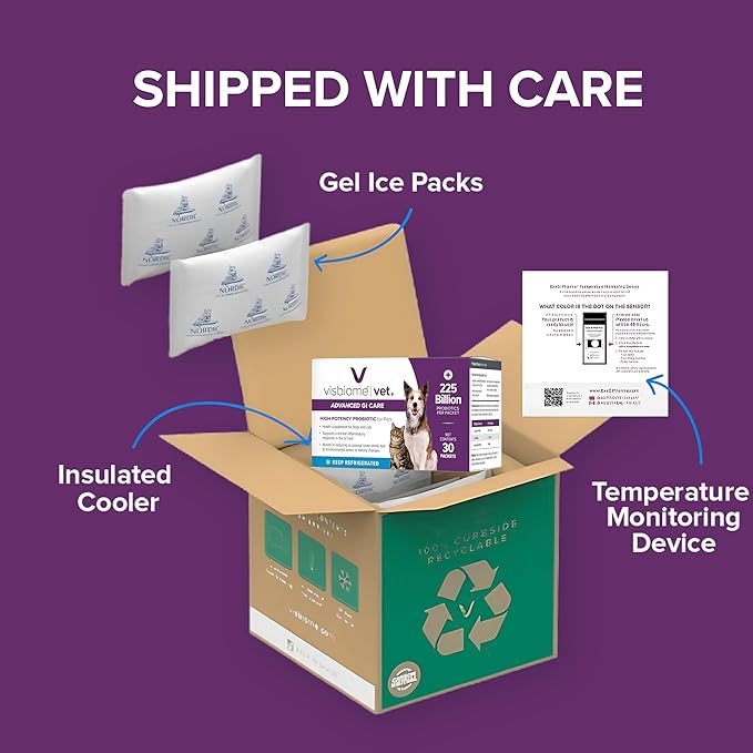 - COLD STORAGE REQUIRED: Visbiome Vet probiotics are shipped and stored under refrigerated conditions (36-46°F, 2-8°C) to ensure maximum potency with icepacks and a temperature monitoring device. It can at room temperature for up to one week without losing potency.