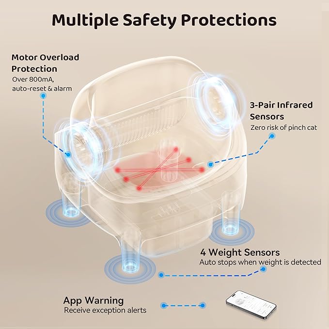 - Smart Safety & App Control: 4 weight + 3 infrared sensors instantly pause cleaning when cats enter. Monitor habits & control remotely via app for peace of mind. The self cleaning cat litter box is connected with 2.4GHz Wi-Fi. With data pushed periodically, you are able to monitor your cat's weight and activity in real time