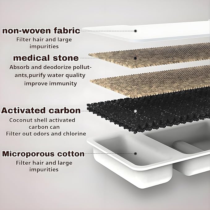 - 3.Quadruple filtration system:This Pawdrate Dog Water Fountain is equipped with a high-efficiency filter to effectively remove impurities, odors, soften water, improve taste, and ensure healthier hydration for your pet.